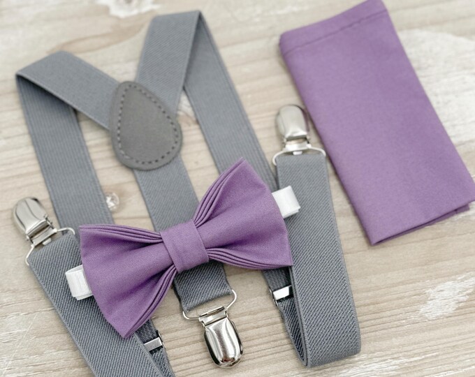 Dusty Mauve Bow Tie & Gray Suspenders Set - Ring Bearer and Groomsman Outfit, Rustic Wedding, Pocket Square, All Sizes Baby to Adult