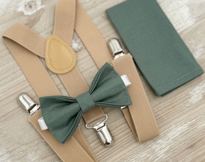 Sage Bow Tie & Tan Suspenders, Khaki Champagne Braces, Pocket square, Boy's Ring Bearer gift, Groomsmen Wedding outfit